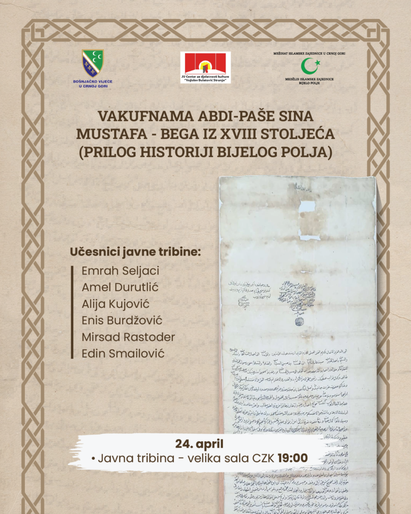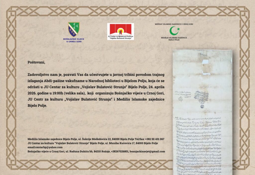 JU Centar za kulturu „Vojislav Bulatović Strunjo“ vas poziva na javnu tribinu „Vakufnama Abdi-paše sina Mustafa-bega iz XVIII stoljeća (prilog historiji Bijelog Polja)”. Tribina će se održati u petak, 24. aprila 2026. godine, u velikoj sali JU Centru za kulturu „Vojislav Bulatović Strunjo“ u Bijelom Polju, sa početkom u 19:00 časova.