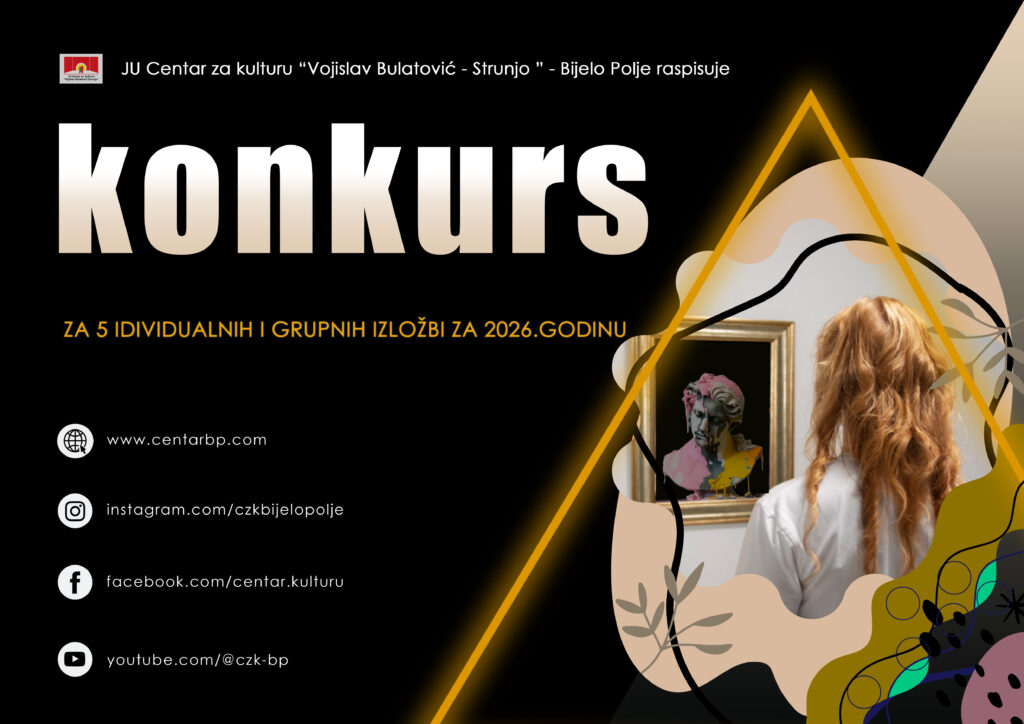 Galerija JU Centar za kulturu „Vojislav Bulatović Strunjo“- Bijelo Polje, petu godinu zaredom, raspisuje konkurs za izlagačku 2026. godinu i poziva sve zainteresovane likovne, primjenjene i multimedijalne akademske umjetnike/ce kao i udruženja umjetnika/ca koji su svojom profesionalnom biografijom stekli umjetničke reference da daju svoje prijedloge za organizovanje samostalnih i grupnih izložbi u slobodnim terminima u 2026. godini.