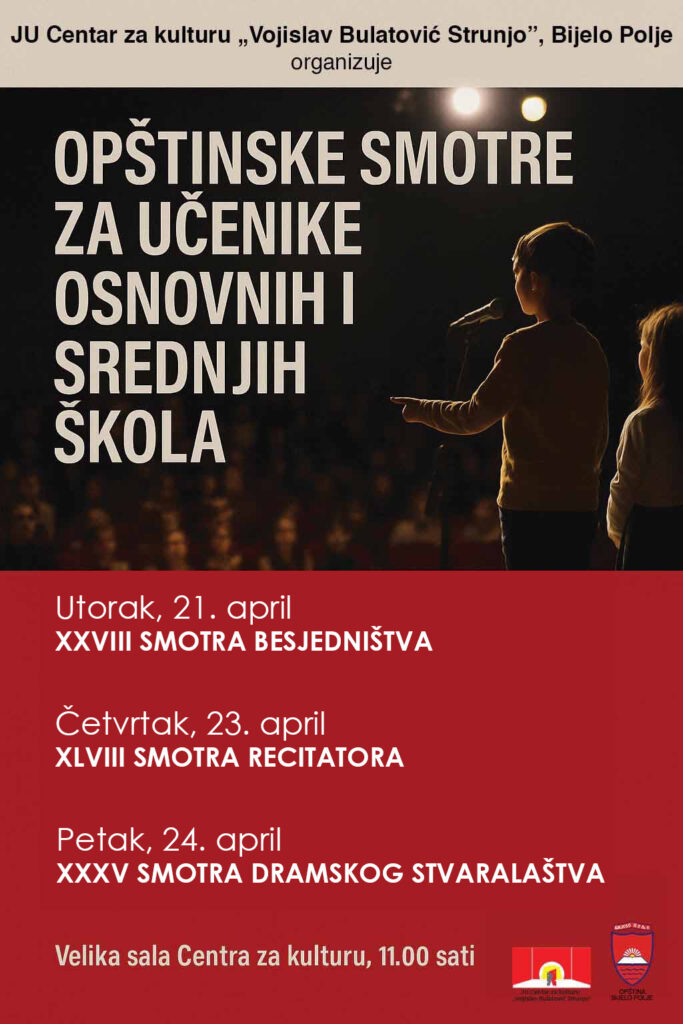 Opštinske smotre počinju 21. aprila XXVIII smotrom besjedništva, nastavljaju se 23. aprila XLVIII smotrom recitatora, a 24. aprila održaće se XXXV smotra dramskog stvaralaštva. Sve smotre će se održati u velikoj sali Centra za kulturu sa početkom u 11.00 sati.Smotre su takmičarskog karaktera, a nastupe učenika će pratiti i vrjednovati stručni žiri. Organizator će svim učenicima uručiti zahvalnice za učešće, a najuspješnijima diplome i knjige. Prvoplasirani takmičari iz sve tri kategorije smotre recitatora predstavljaće Bijelo Polje na Državnoj smotri recitatora u Beranama.
