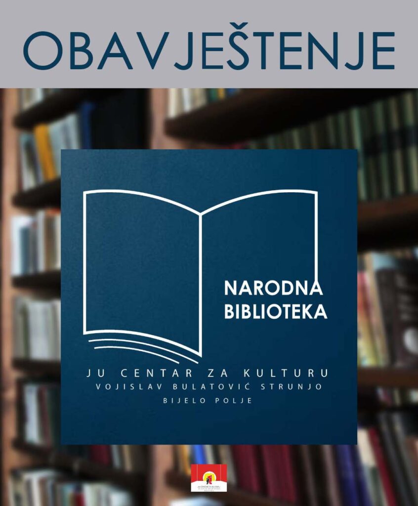Narodna biblioteka JU Centar za kulturu ’’Vojislav Bulatović Strunjo’’ Bijelo Polje obavještava javnost da tokom februara 2026. godine neće raditi sa korisnicima, zbog sprovođenja redovne revizije knjižnog fonda.
