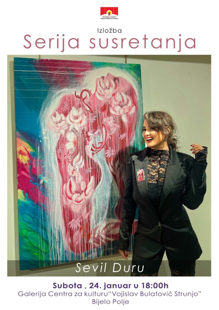 Bjelopoljski Centar za kulturu „Vojislav Bulatović Strunjo“ organizuje samostalnu izložbu umjetnice Sevil Duru, pod nazivom „Serija susretanja“, koja će biti otvorena 24. januara 2026. godine u 18:00 časova, u galeriji Centra za kulturu.