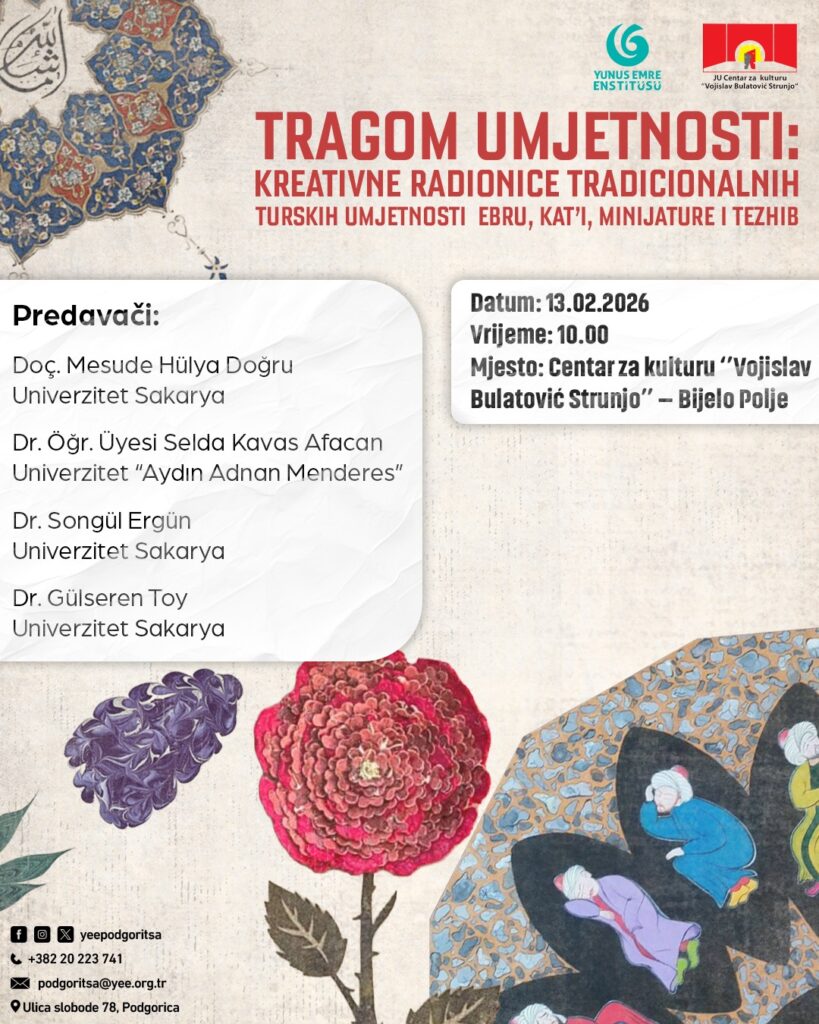 Kreativne radionice tradicionalnih turskih umjetnostiEbru, Kat’i, minijature i tezhib. Centar za kulturu „Vojislav Bulatović Strunjo“ – Bijelo Polje,u saradnji sa Institutom Yunus Emre Podgorica,organizuje besplatne kreativne radionice tradicionalnih turskih umjetnosti.
